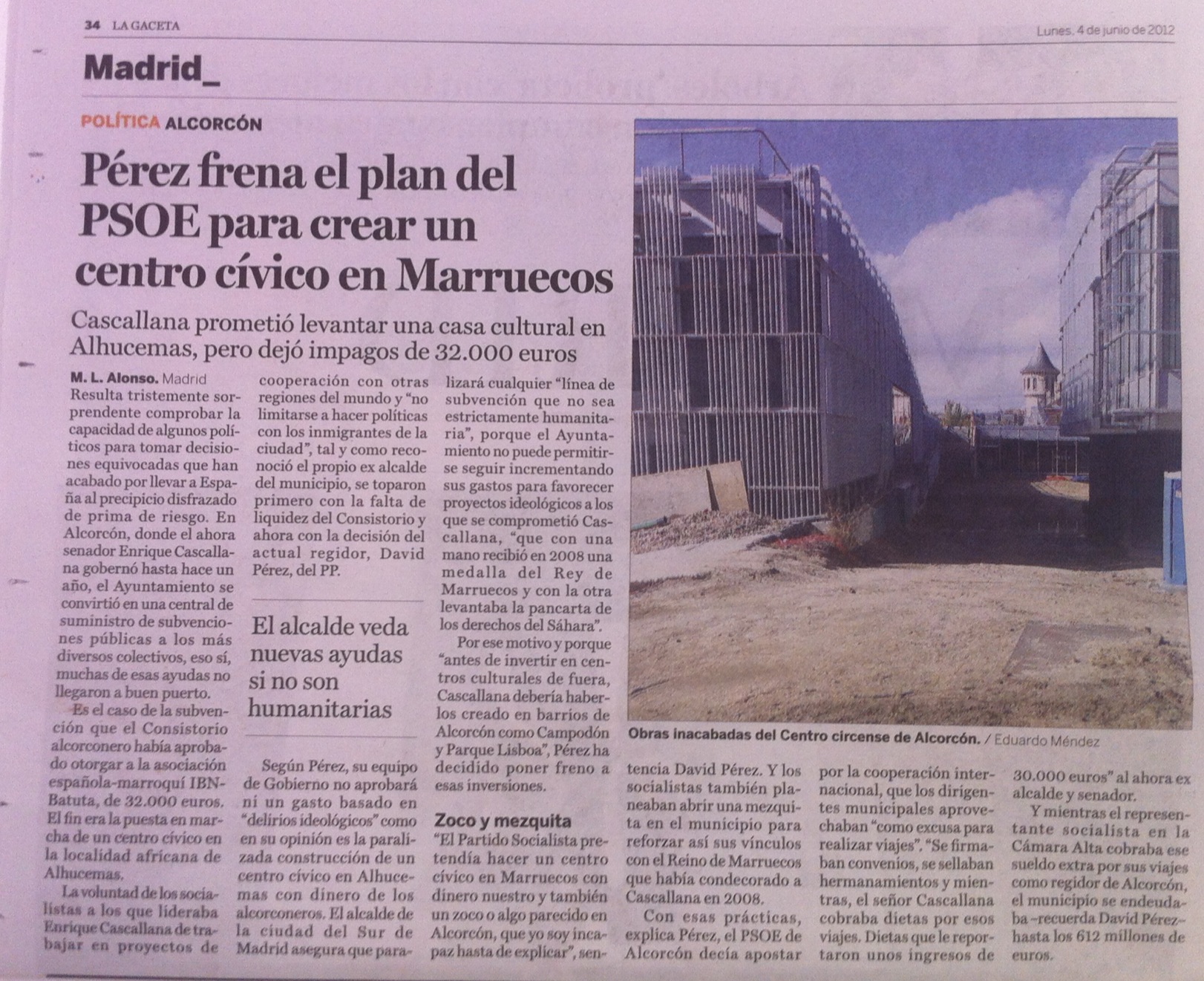 El Partido Popular de Alcorcón confirmó hoy, a través de un comunicado, que el proyecto que el PSOE había planeado para construir en Marruecos un Centro Cívico con dinero de todos los vecinos de Alcorcón, no se llevará a cabo por cuestiones de responsabilidad y de carácter administrativo. Así, los populares explicaron que el Partido Socialista concedió una subvención para la construcción del centro, pese a que no había dinero para llevarla a cabo». «Prometían multitud de cosas sin importarles haber llegado a engordar la deuda municipal hasta los 612 millones de euros».