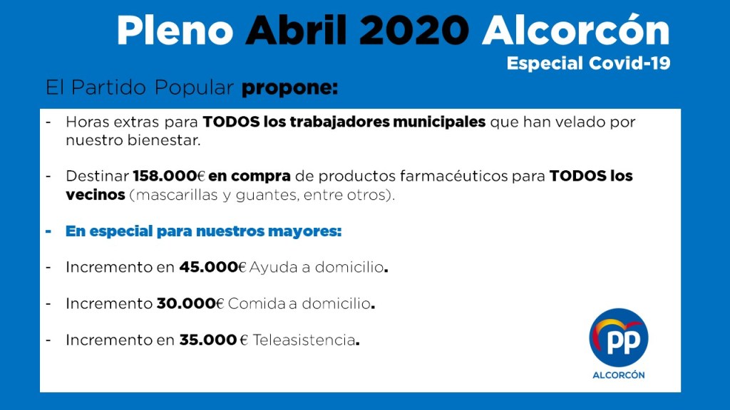 Ante esta nueva muestra de ineficacia e incapacidad del Gobierno municipal, y ante su falta de sensibilidad social en una circunstancia tan delicada, el Grupo Popular propone modificar las partidas presupuestarias presentadas por el Gobierno e incorporar otras que incluyan la compra de tests, mascarillas y guantes, el pago de horas extras a todos los trabajadores público, y el incremento de las partidas destinadas a ayuda a domicilio.