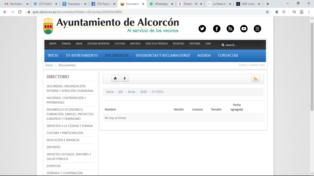 En respuesta a una solicitud de información a la alcaldesa realizada por los populares sobre las juntas de gobierno, el director general de Alcaldía ha enviado el 13 de mayo al Grupo Municipal Popular en el que reconoce que todas las actas de Junta de Gobierno celebradas en este periodo se encuentran en la web.