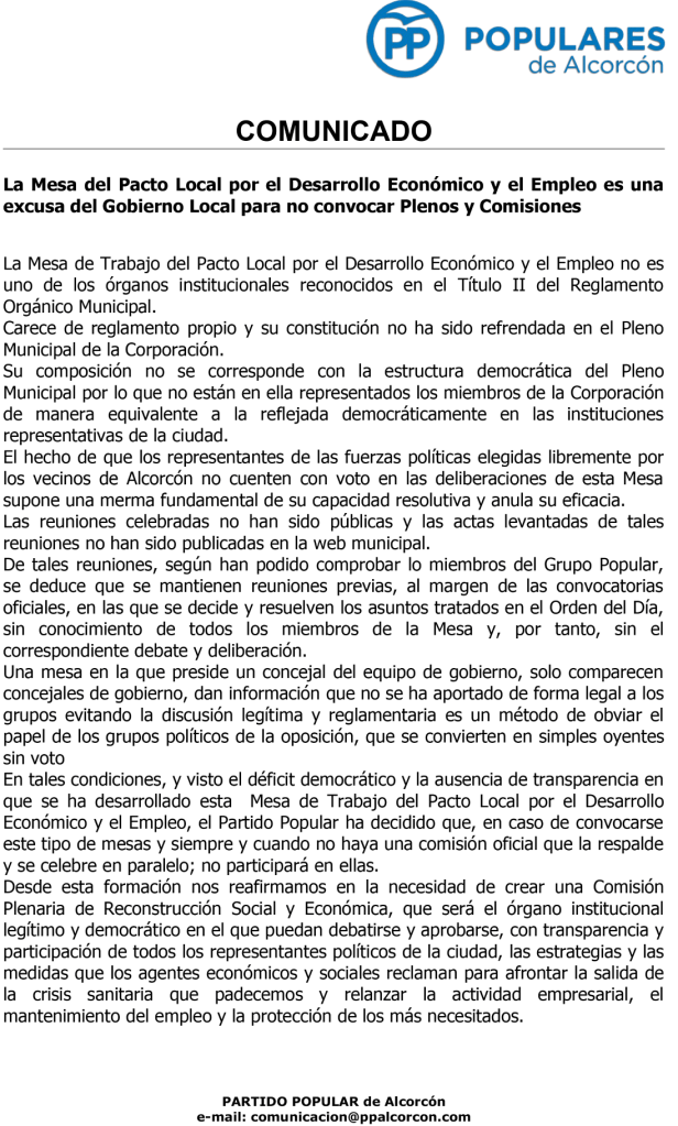 En tales condiciones, y visto el déficit democrático y la ausencia de transparencia en que se ha desarrollado esta Mesa de Trabajo del Pacto Local por el Desarrollo Económico y el Empleo, el Partido Popular ha decidido que, en caso de convocarse este tipo de mesas y siempre y cuando no haya una comisión oficial que la respalde y se celebre en paralelo; no participará en ellas.