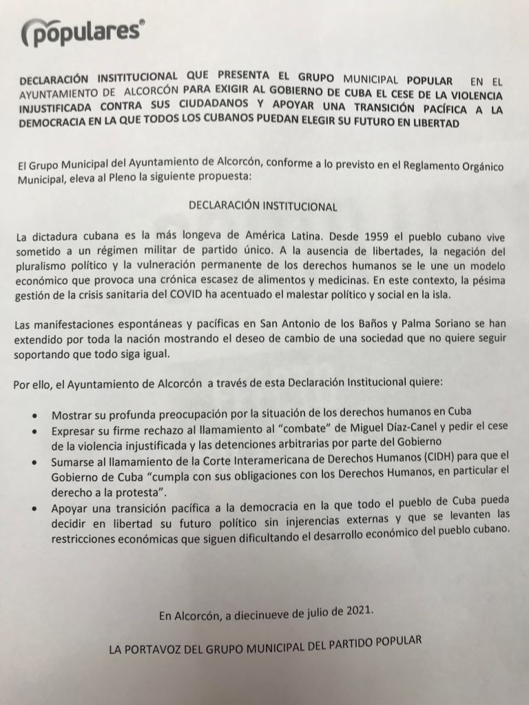 La declaración recogía mostrar desde Alcorcón “su profunda preocupación por la situación de los derechos humanos en Cuba; expresar su firme rechazo al llamamiento al “combate” del actual dictador Miguel Díaz-Canel y pedir el cese de la violencia injustificada y las detenciones arbitrarias; sumarse al llamamiento de la Corte Interamericana de Derechos Humanos para que el Gobierno de Cuba “cumpla con sus obligaciones con los derechos humanos, en particular el derecho de protesta y manifestación” ; y “apoyar una transición pacífica a la democracia en la que todo el pueblo de Cuba pueda decidir en libertad su futuro político”.
