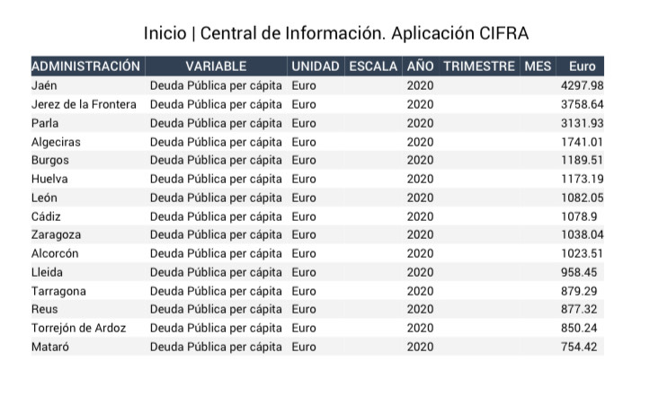 El Ministerio de Hacienda y función pública ha publicado en su página web los últimos datos sobre los municipios con más deuda per cápita de España. De entre los 15 municipios más endeudados, Alcorcón ocupa el 10º lugar dentro de este ranking económico que valora el grado de endeudamiento por habitante de las ciudades con más de 100.000 habitantes. La deuda asciende a 1.023,51 € por vecino.