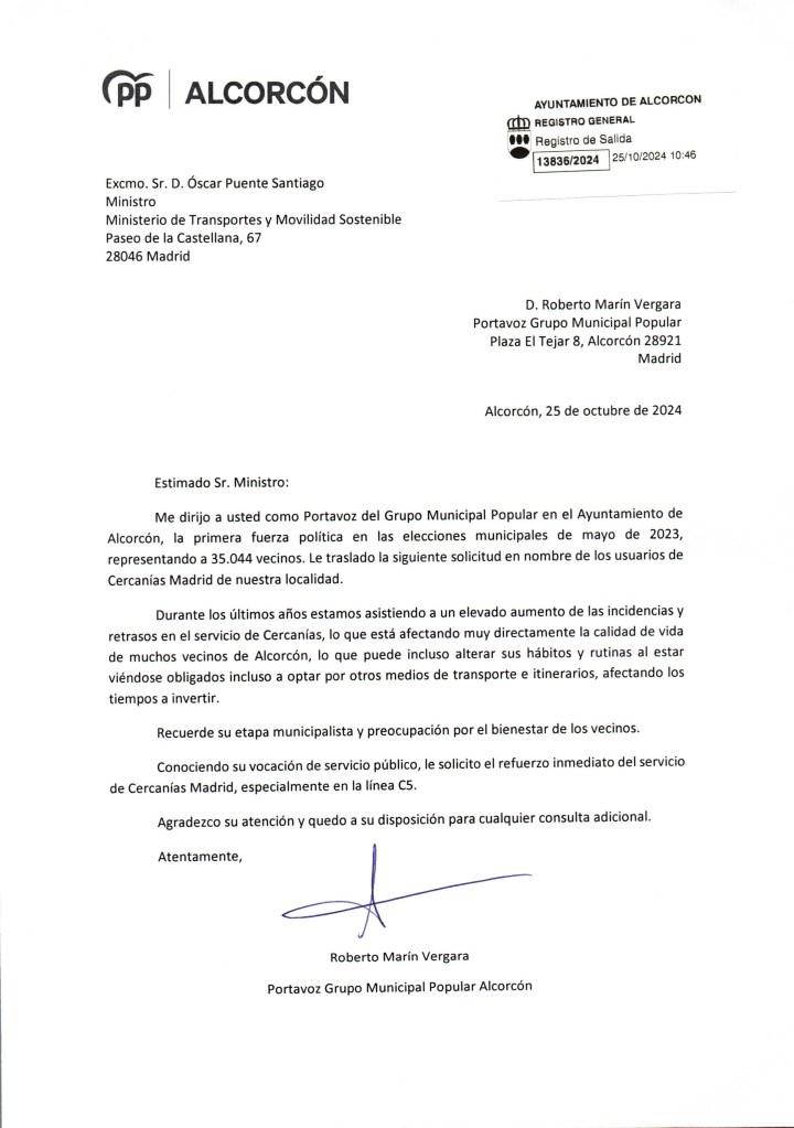 Alcorcón, 25 de octubre de 2024.- El Portavoz del Partido Popular en el Ayuntamiento de Alcorcón, Roberto Marín Vergara, en representación de los 35.044 vecinos que votaron por esta formación en las elecciones municipales, ha remitido una carta al Ministro de Transportes y Movilidad Sostenible, D. Óscar Puente Santiago. En dicha carta, se solicita con carácter de urgencia el refuerzo del servicio de Cercanías Madrid, especialmente en la línea C5, debido al notable aumento de incidencias y retrasos que afectan gravemente a los usuarios de Alcorcón.