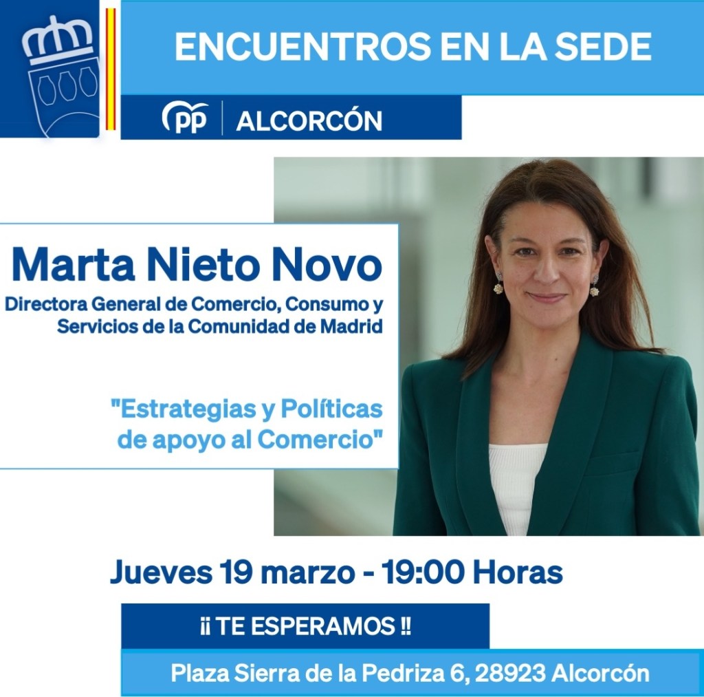 Tras un proceso de escucha activa y de primera mano sobre las necesidades y preocupaciones del comercio local en Alcorcón, el Grupo Popular ha organizado un encuentro abierto dirigido a este colectivo. El acto contará con la participación de Marta Nieto Novo, Directora General de Comercio, Consumo y Servicios de la Comunidad de Madrid, y tendrá lugar este próximo jueves 19 de marzo, a las 19:00 horas, en la sede situada en Plaza Sierra de la Pedriza, 6 (Alcorcón).