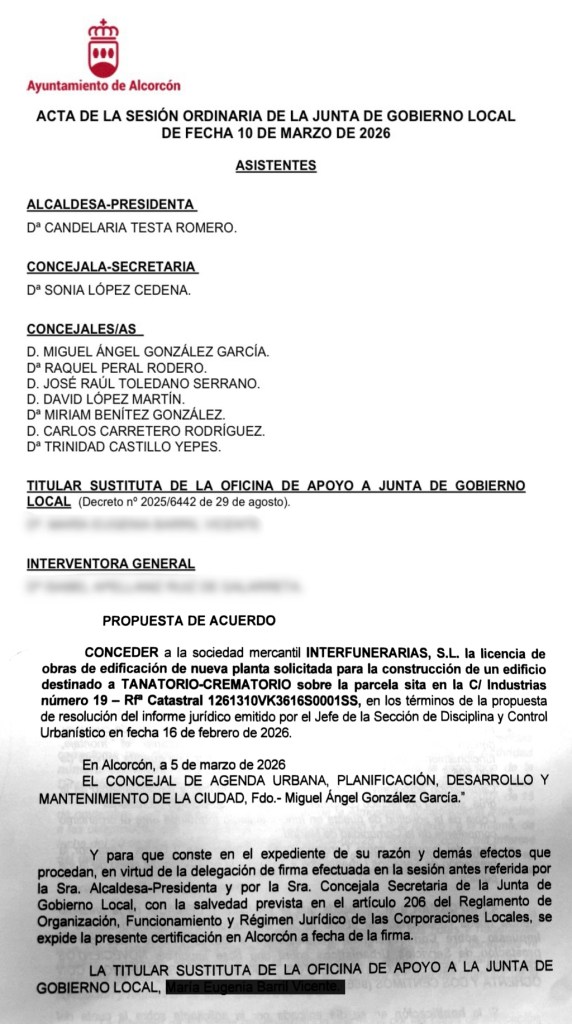 10 de marzo de 2026: La Junta de Gobierno Local aprueba por unanimidad la concesión de la licencia de obras de edificación de nueva planta a INTERFUNERARIAS, S.L. para la construcción de un edificio destinado a tanatorio-crematorio en la parcela ubicada en la calle Industrias nº 19.