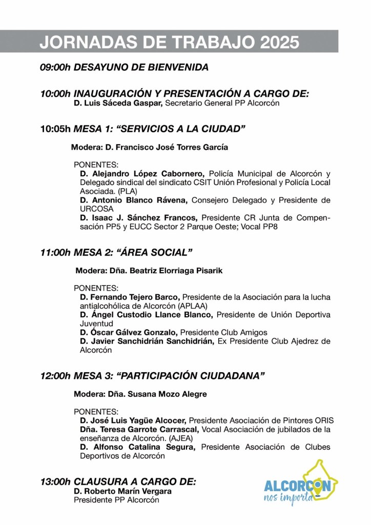Cada mesa contará con la participación de representantes reconocidos en su ámbito, que compartirán no solo su diagnóstico sobre la situación actual, sino también propuestas y soluciones concretas basadas en su experiencia directa. Los asistentes podrán intervenir, opinar y aportar ideas que serán recogidas para dar continuidad al trabajo iniciado. Según Roberto Marín Vergara, presidente del Partido Popular de Alcorcón. “El valor de estas jornadas está en que los propios vecinos sean protagonistas del cambio. Son ellos quienes mejor conocen los problemas y quienes pueden ofrecer soluciones desde la experiencia y la colaboración. Son los encargados de reconstruir Alcorcón”.