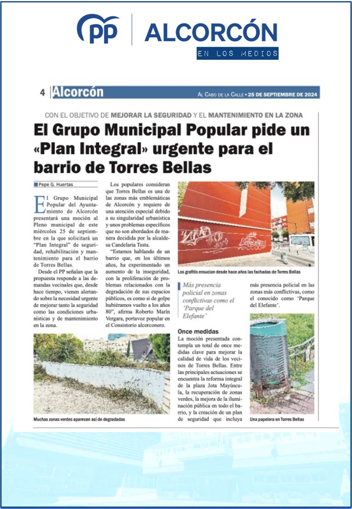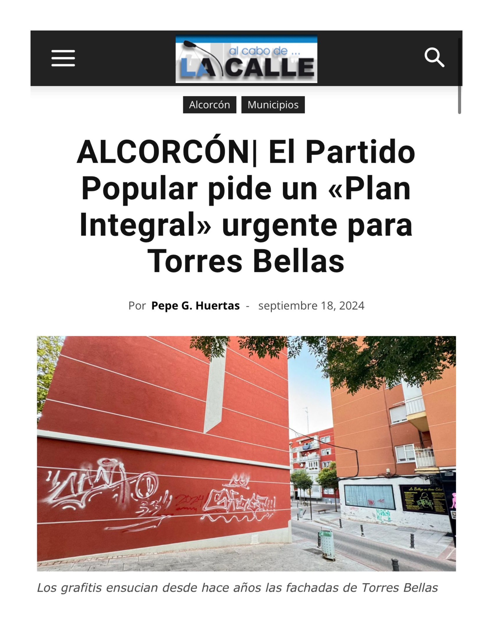 El Partido Popular de Alcorcón solicita al Ayuntamiento un «Plan Integral» urgente para el barrio de Torres Bellas