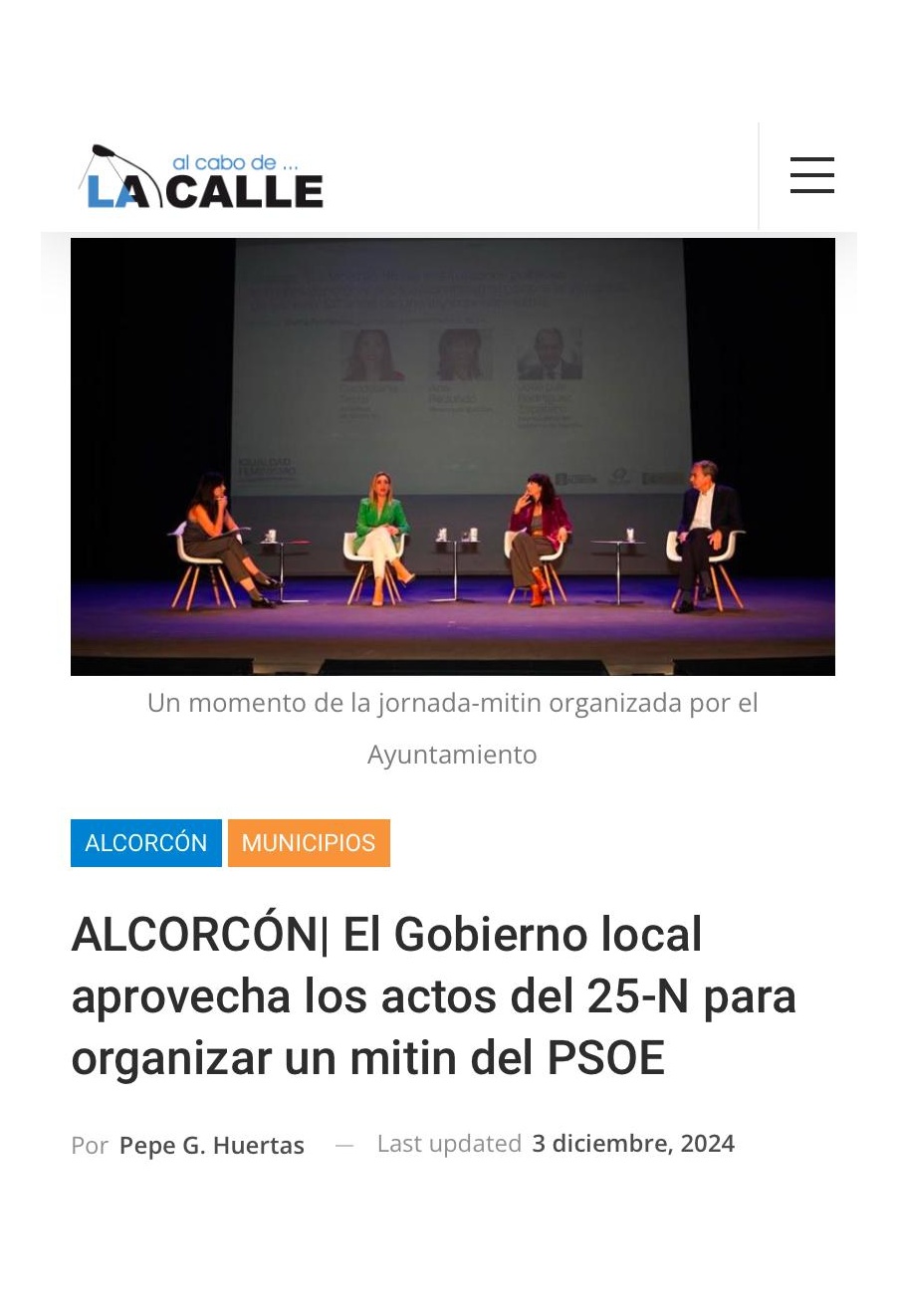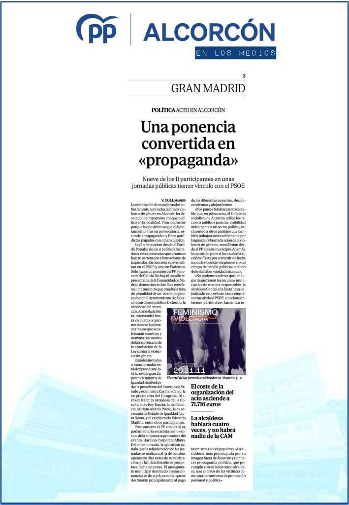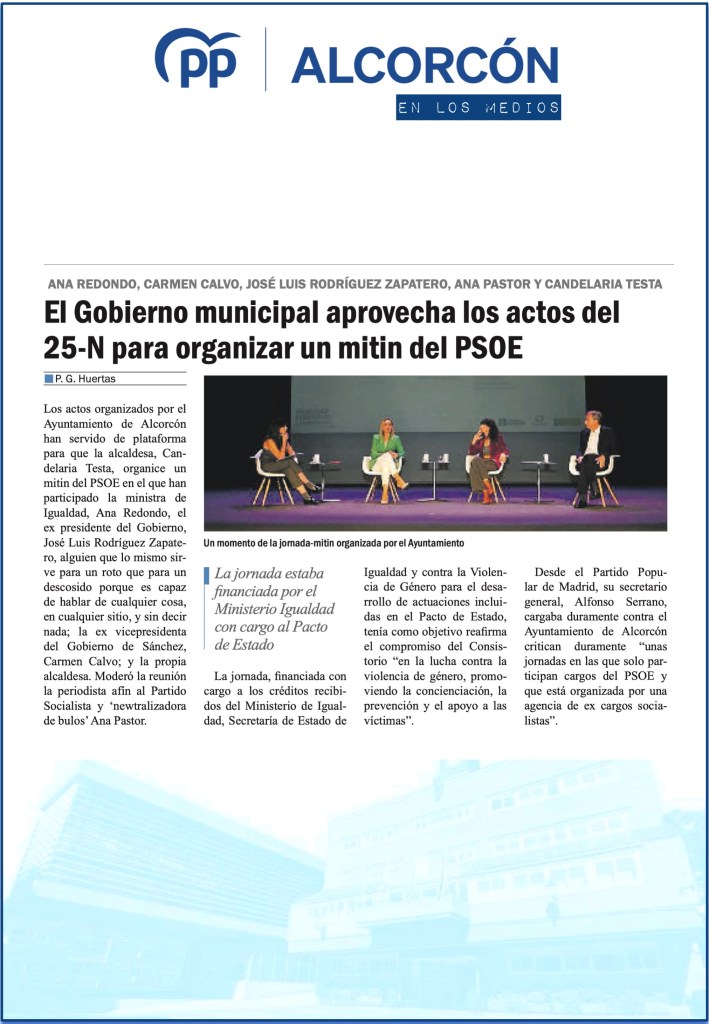 ALCORCÓN. – SERRANO CRITICA QUE «AMIGOS SOCIALISTAS» COPEN LAS JORNADAS DE VIOLENCIA DE GÉNERO DEL AYUNTAMIENTO