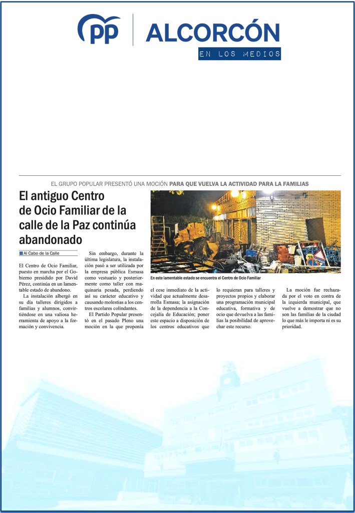 EL PP DE ALCORCÓN PROPONE RECUPERAR EL ANTIGUO CENTRO DE OCIO FAMILIAR DE LA CALLE DE LA PAZ