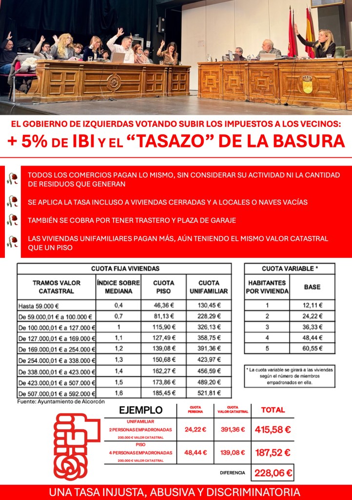 | 18 jul 2025 | Moción rechazada por el Pleno para reformar la tasa: denuncian cobros injustos. | Candelaria Testa se niega a corregir la injusta tasa de basuras y vuelve a castigar a los vecinos. PP Alcorcón |